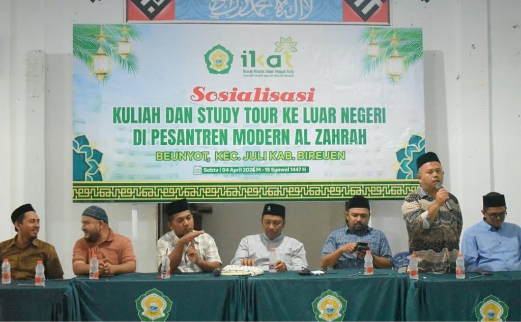 Pesantren Modern Al Zahrah Bireuen berkolaborasi dengan Ikatan Alumni Timur Tengah (IKAT) Aceh menggelar kegiatan Sosialisasi Kuliah dan Study Tour ke Luar Negeri untuk para santri setempat, Ahad, 4 April 2026.