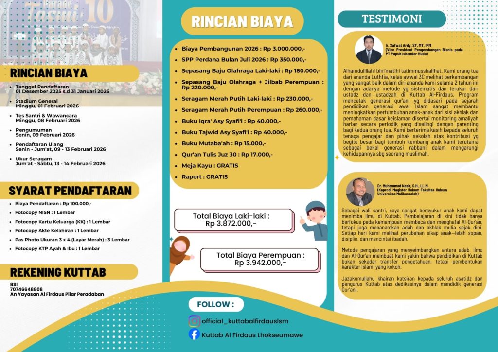 Biaya Lainnya: Meliputi infaq pembangunan awal, biaya seragam, rapor, dan modul pembelajaran